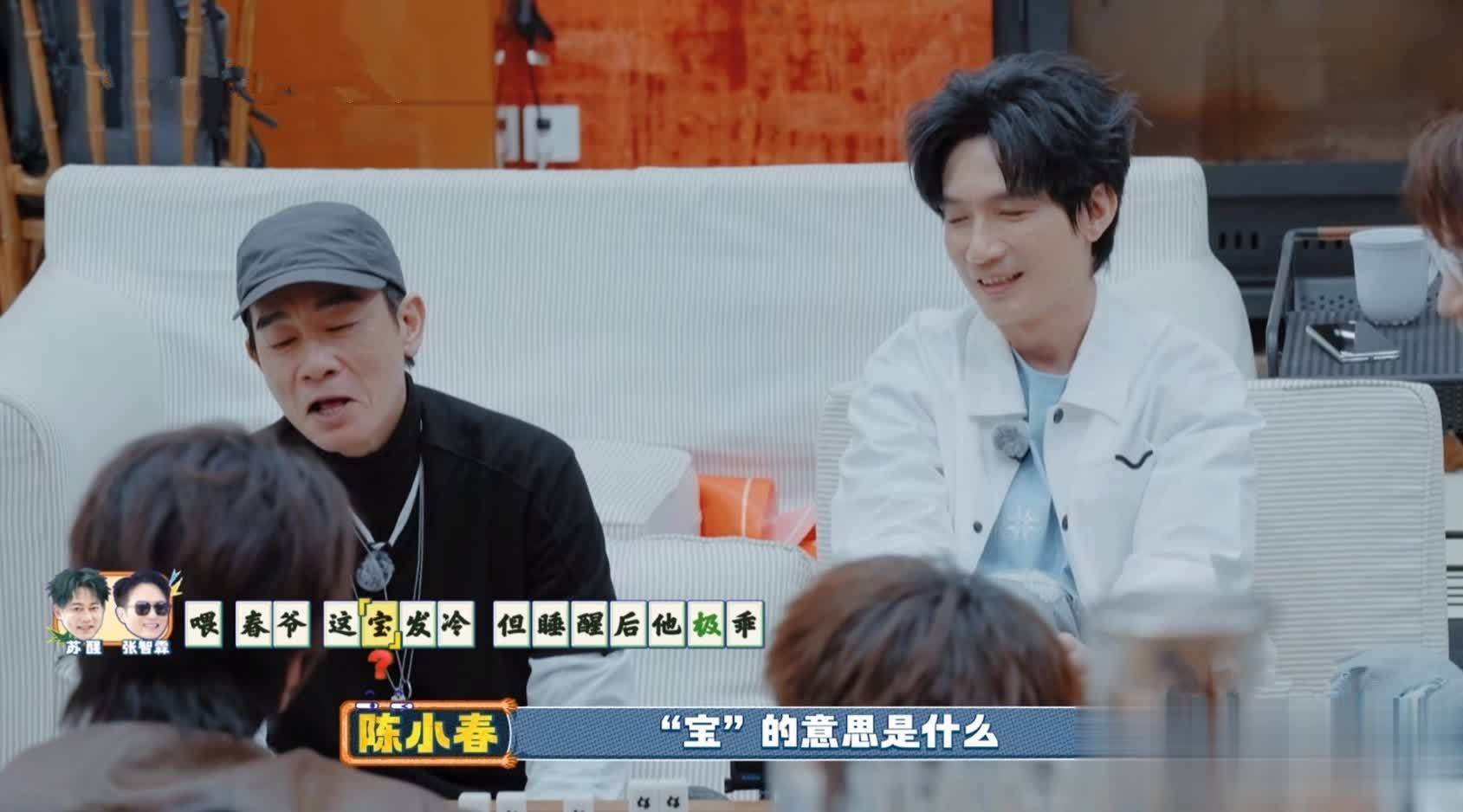 这牌一亮,大家都知道了,原来苏醒、张智霖一开始针对的就是春爷陈小春,然而他们觉得这句子虽是好笑,但也不至于让他们笑得那么没形象吧,也不知道摆这句子的人的诸多笑点到底在哪里。甚至陈小春还疑惑这“宝”的意思是什么?苏醒跟本尊解释说是宝宝(baby)的意思。春爷觉得这句子对自己也没什么伤害嘛,不过是叫了一声“春爷”,自然是认可句子的逻辑的。